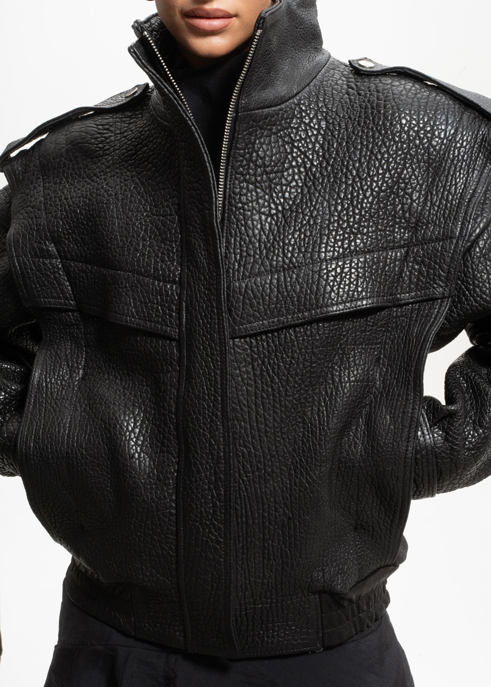 Crna jakna od prirodne teksturisane ovčije kože sa srebrnim detaljima. Oversize kroja sa lastišom oko struka, dubokim džepovima i ziper kopčanjem. Naramenice i epolete dodaju strukturu i intenzivniji stil.