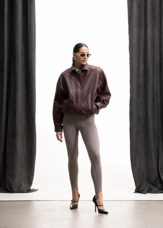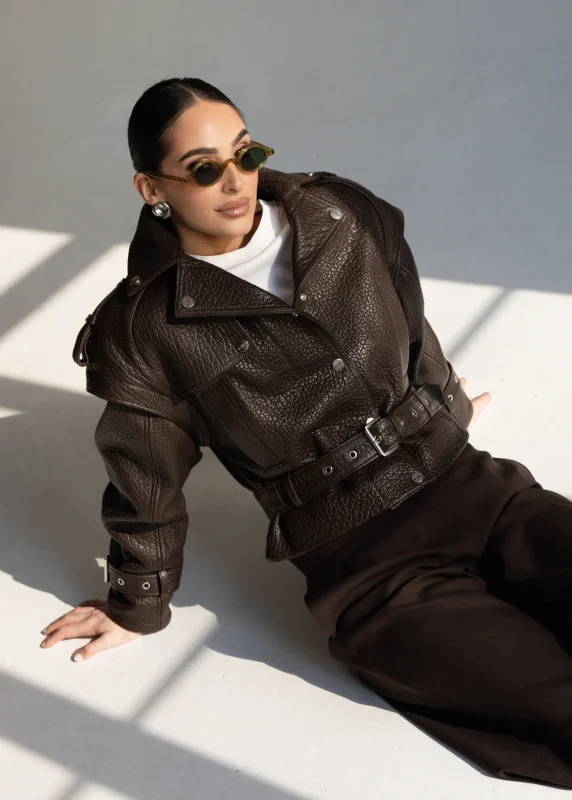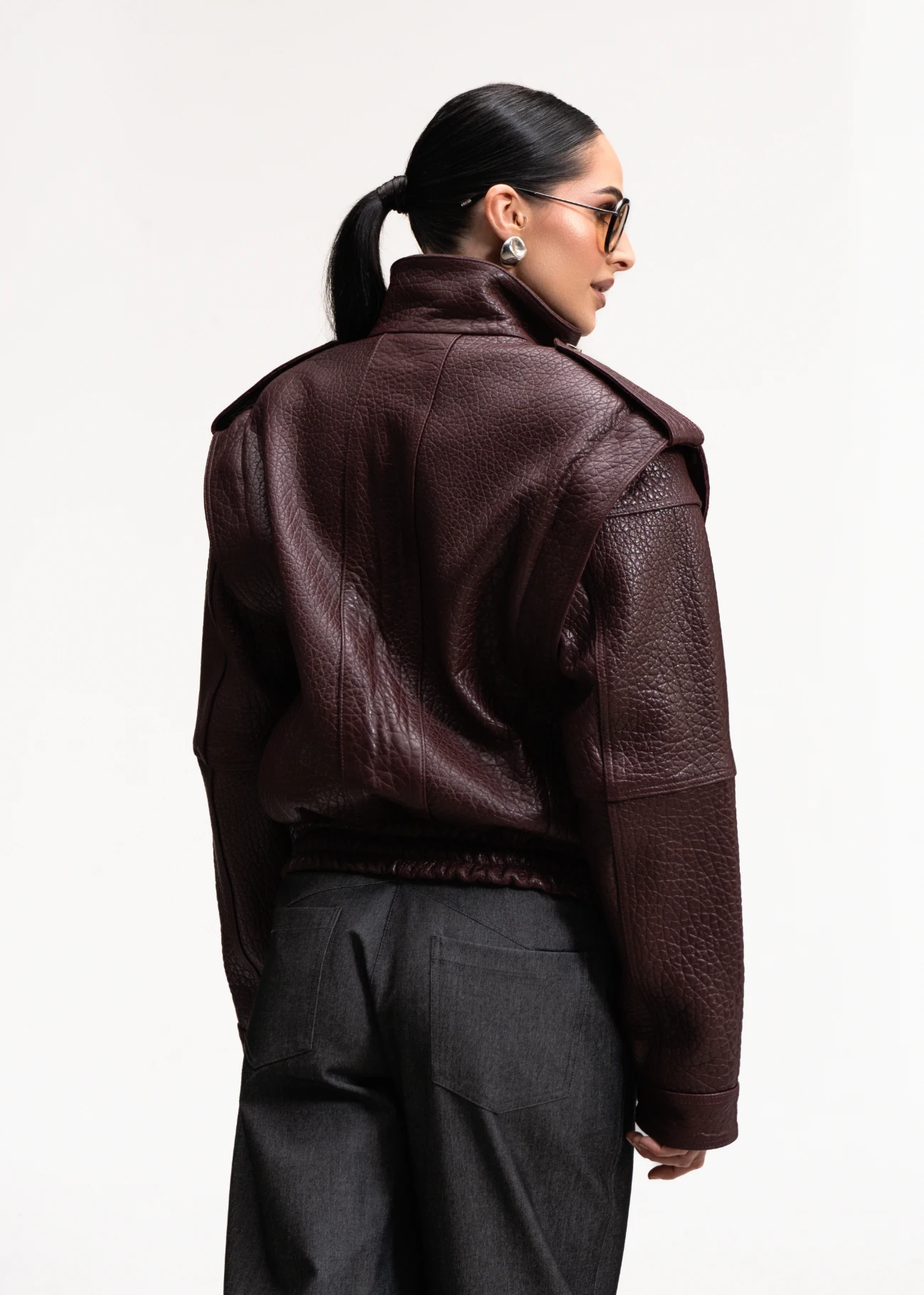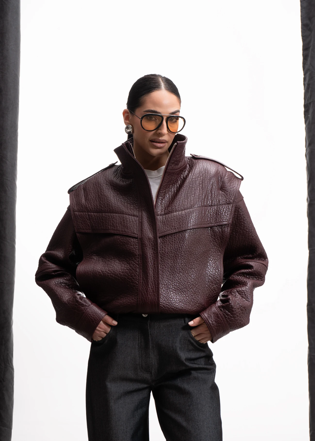 Bordo jakna od prirodne teksturisane ovčije kože sa srebrnim detaljima. Skidanjem rukava, ovu jaknu možete nositi i kao prsluk. Model je oversize kroja sa lastišem oko struka, dubokim džepovima i ziper kopčanjem. Naramenice i epolete dodaju strukturu i intenzivniji stil.