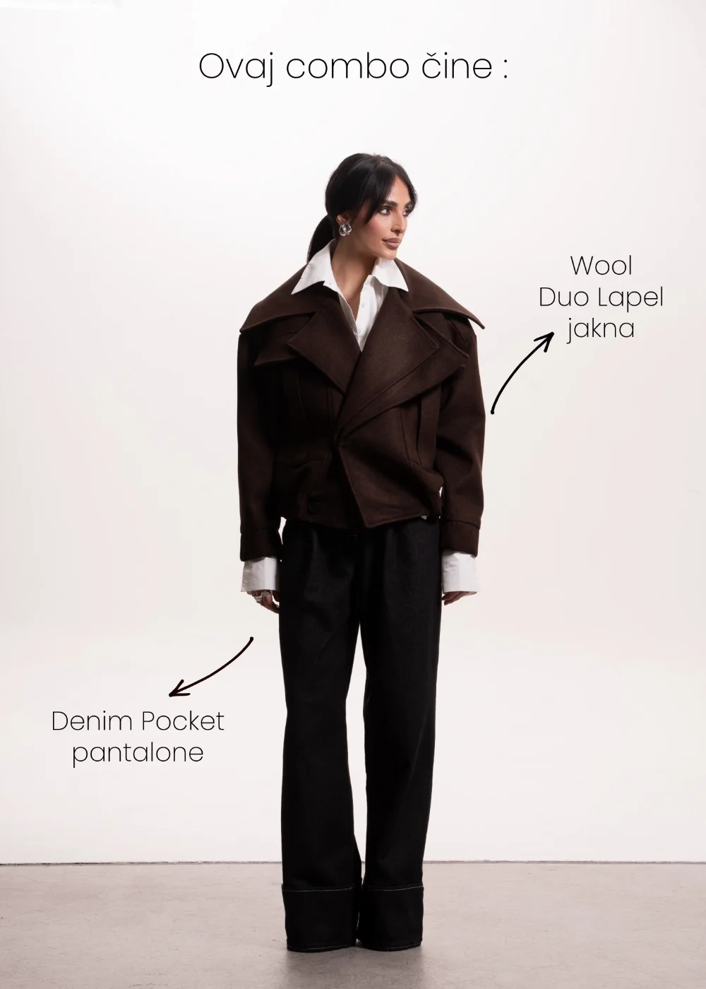 Wool Duo Lapel jakna od vune, u braon boji. Oversize kroja sa lastišom i kopčanjem na dugmad. Naglašene naramenice. Dimenzionisana kragna sa duplim reverom i dva prostrana džepa na prednjoj strani.