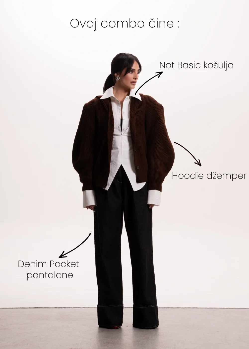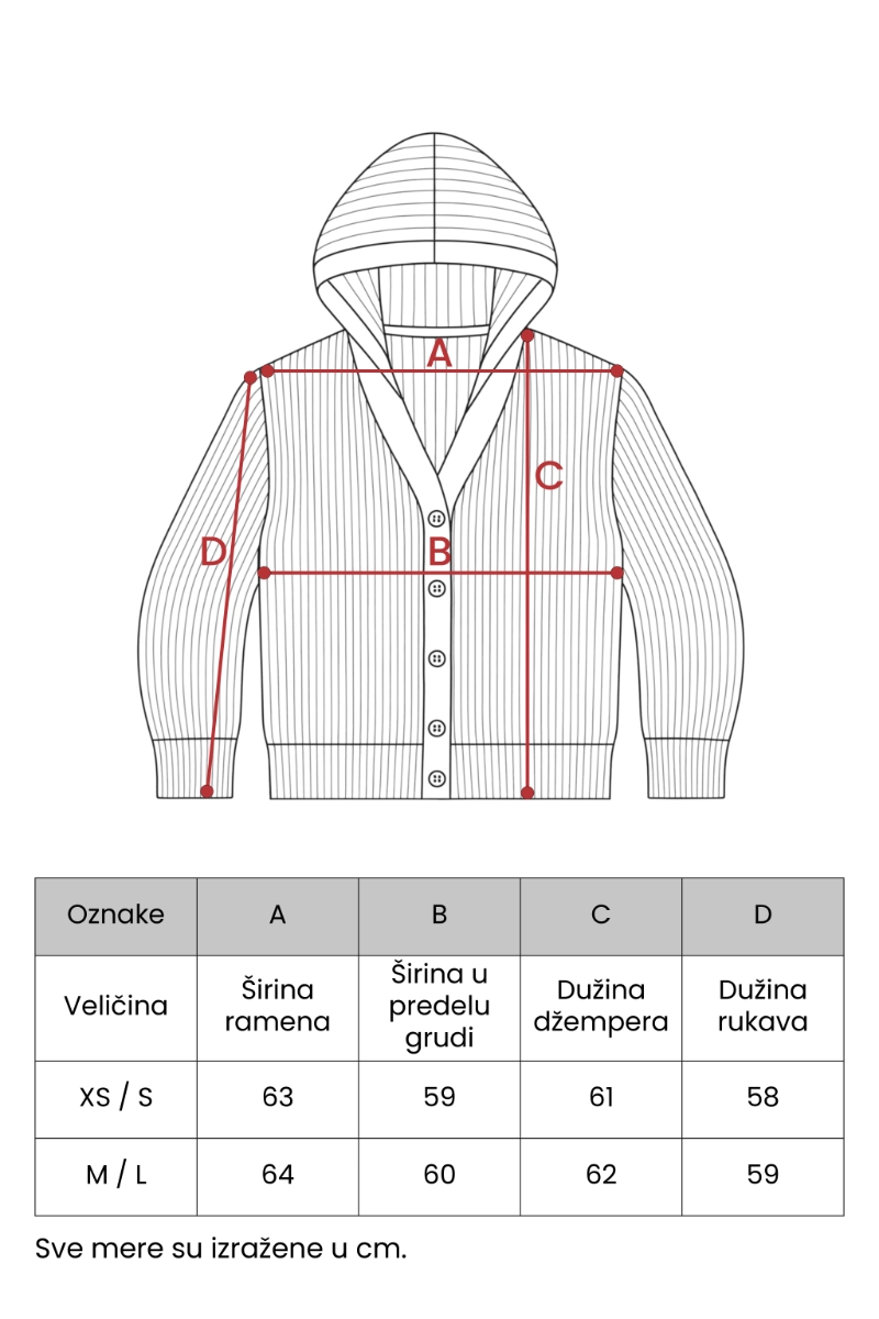 Hoodie džemper od pletiva sa kapuljačom i naglašenim naramenicama, oversize kroja, sa crnim dugmadima za otkopčavanje.