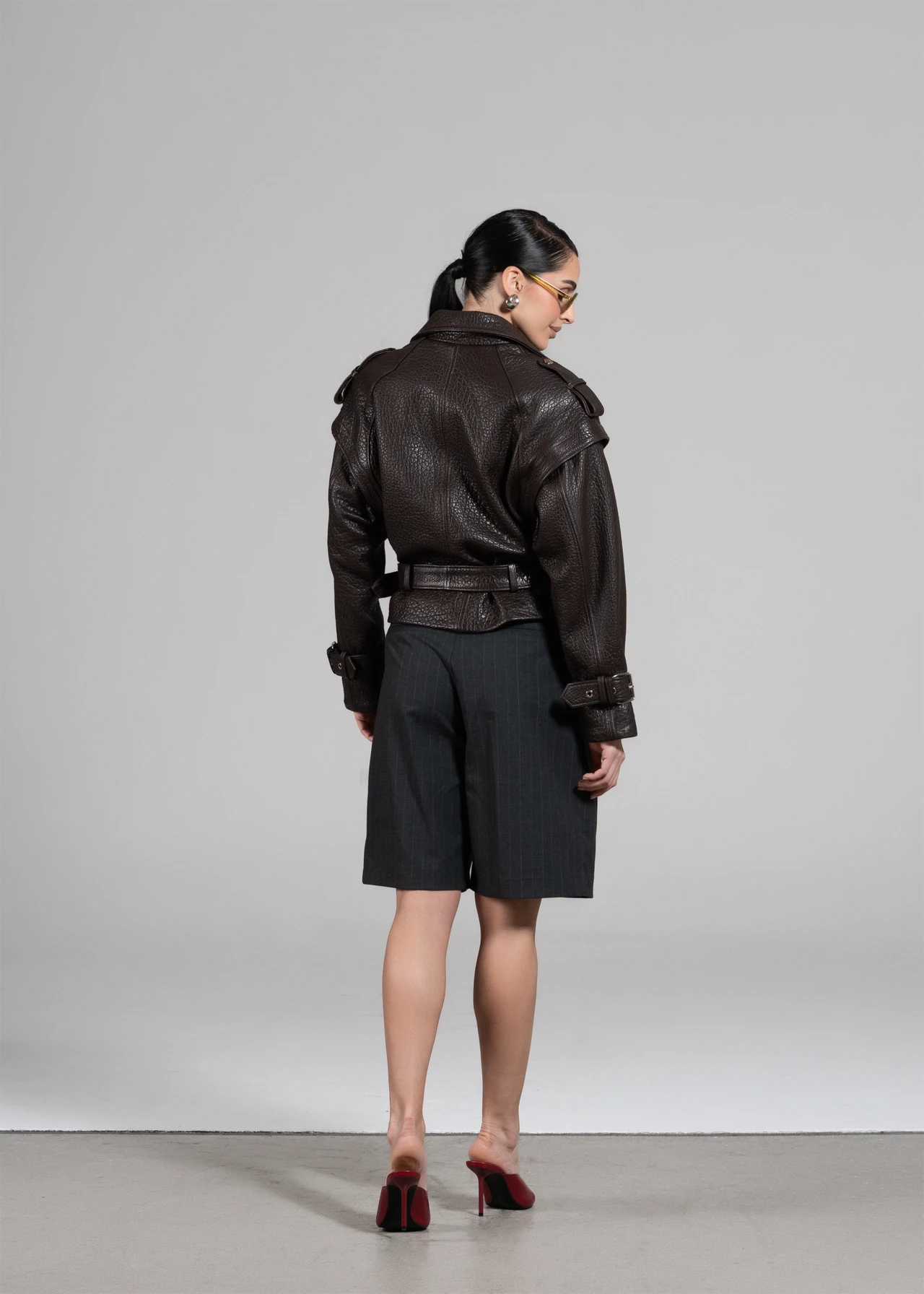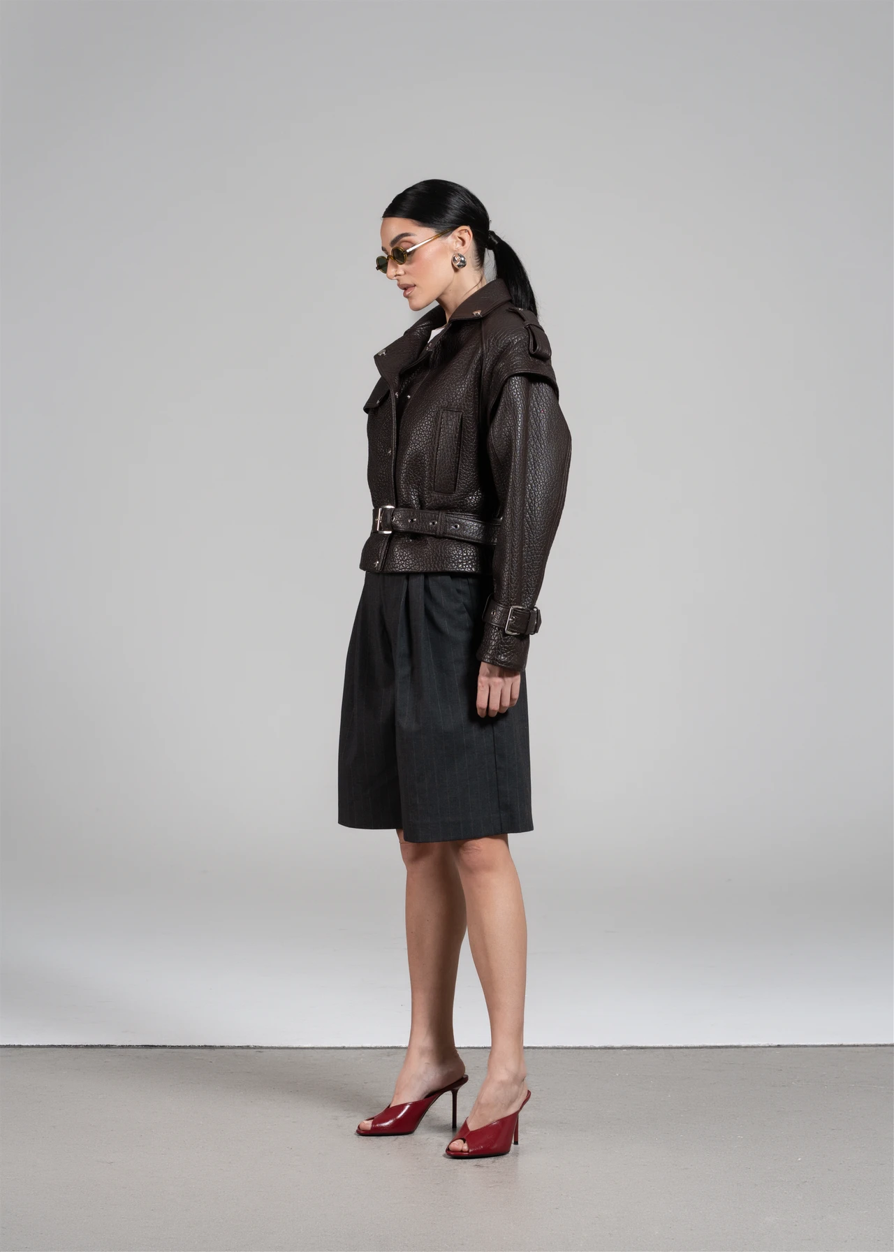Braon jakna od prirodne teksturisane ovčije kože sa srebrnim detaljima. Skidanjem rukava, ovu jaknu možete nositi i kao prsluk. Model je oversize kroja sa istaknutim naramenicama i epoletama. Kopčanje nitnama uz podesive kaiševe.