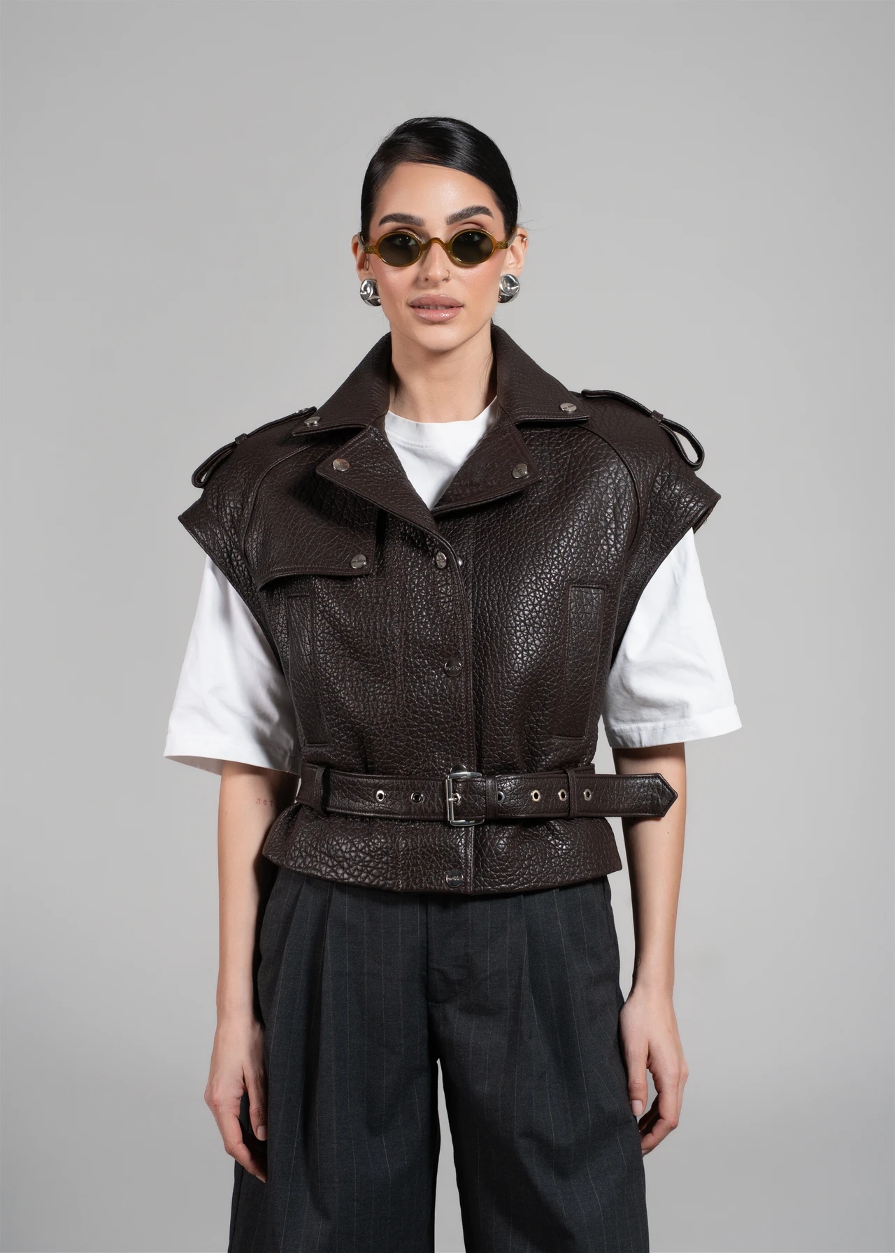 Scandinavian Textured Kožna Jakna/Prsluk – Braon