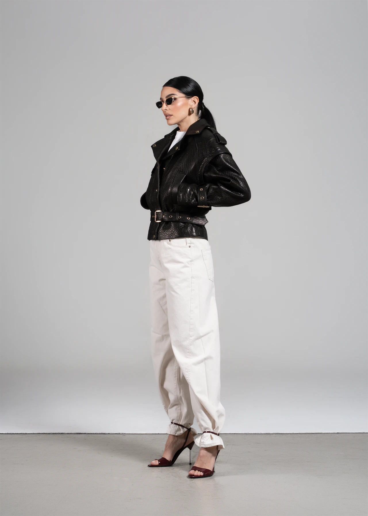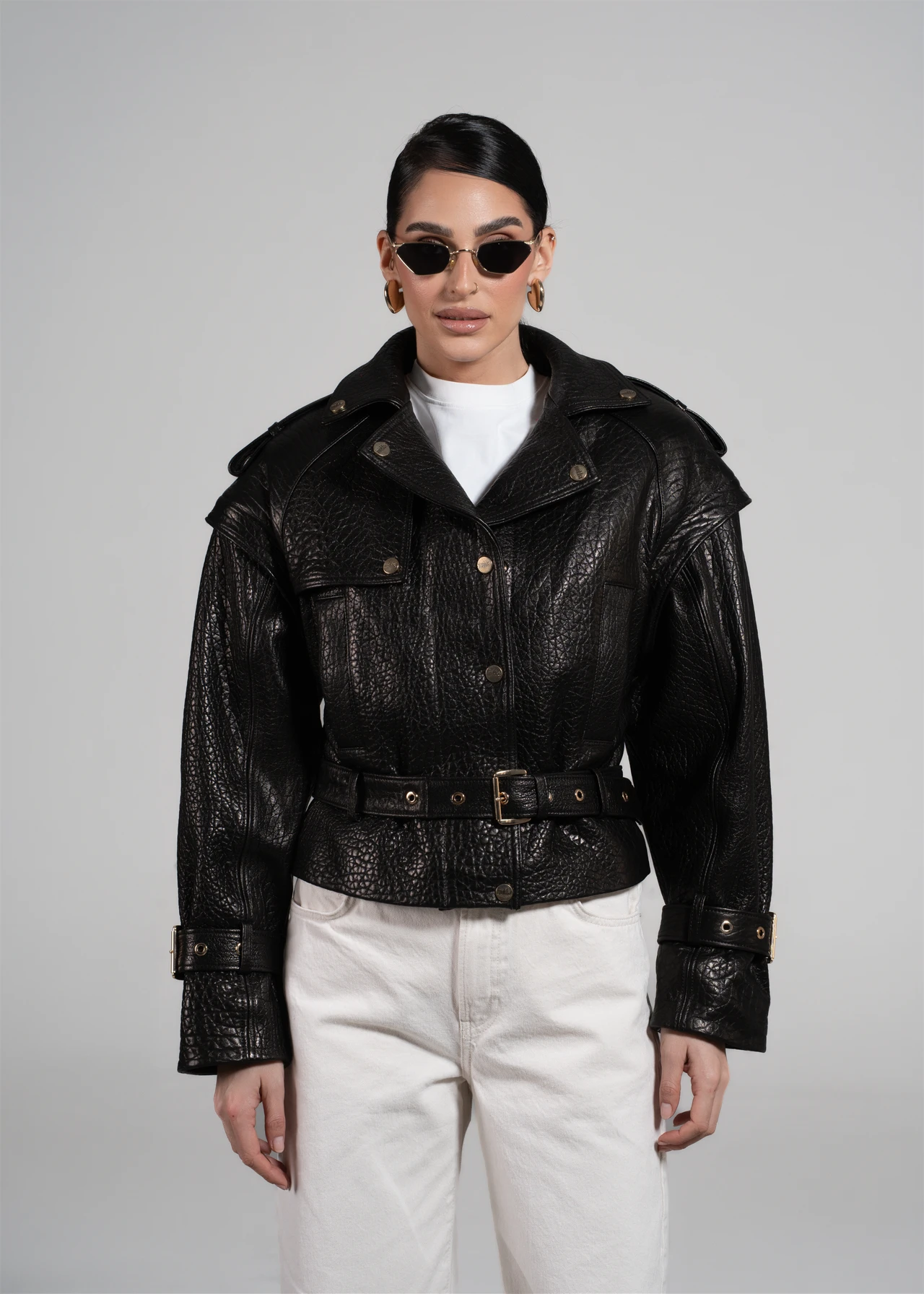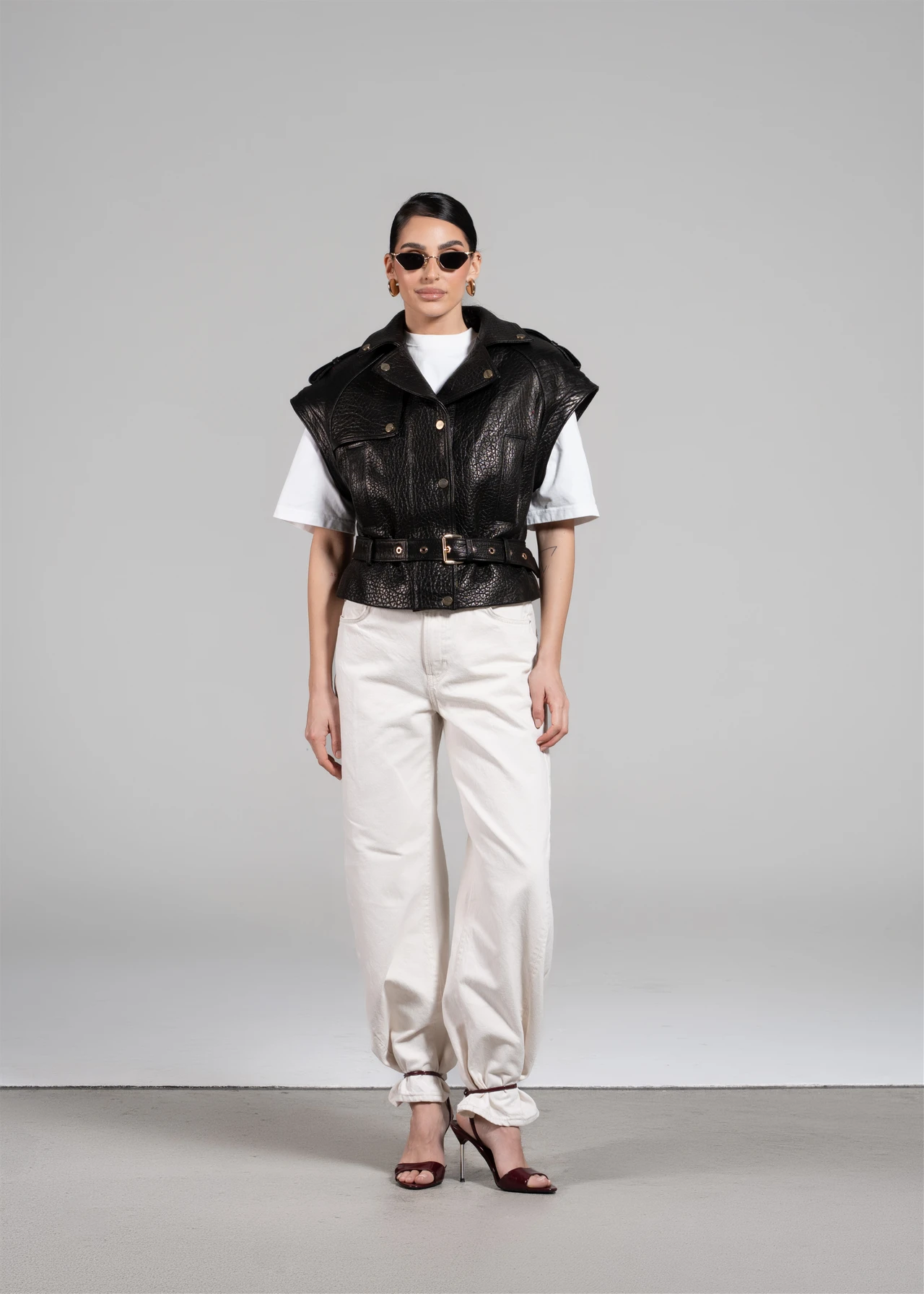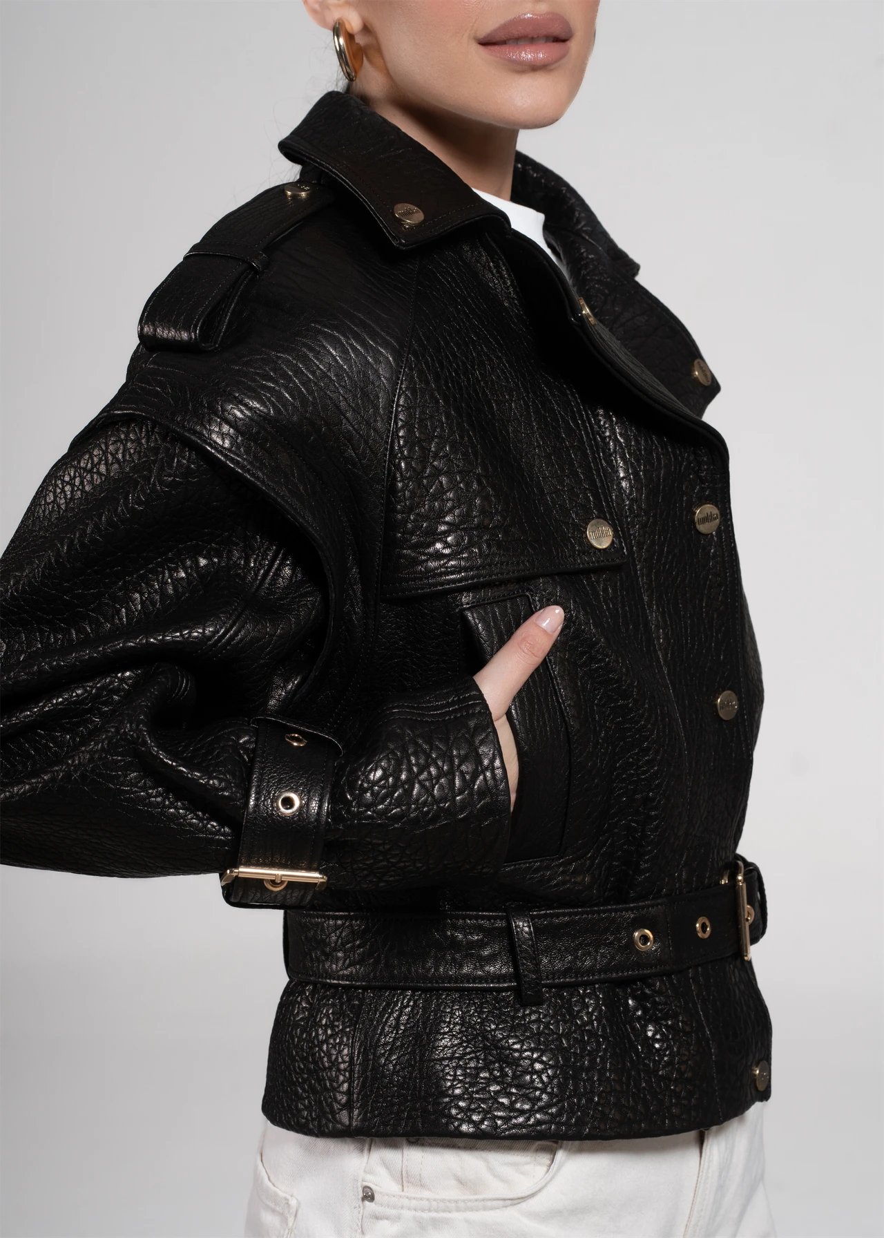 Crna jakna od prirodne teksturisane ovčije kože sa zlatnim detaljima. Skidanjem rukava, ovu jaknu možete nositi i kao prsluk. Model je oversize kroja sa istaknutim naramenicama i epoletama. Kopčanje nitnama uz podesive kaiševe.