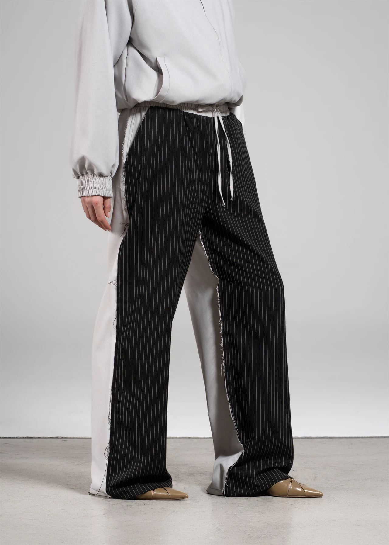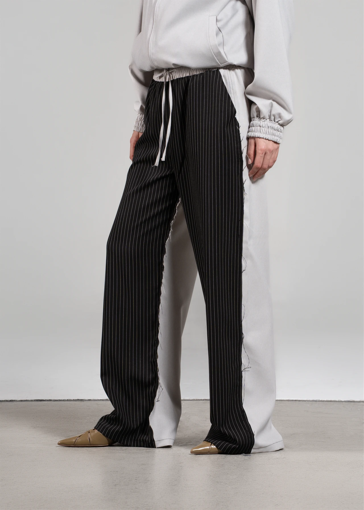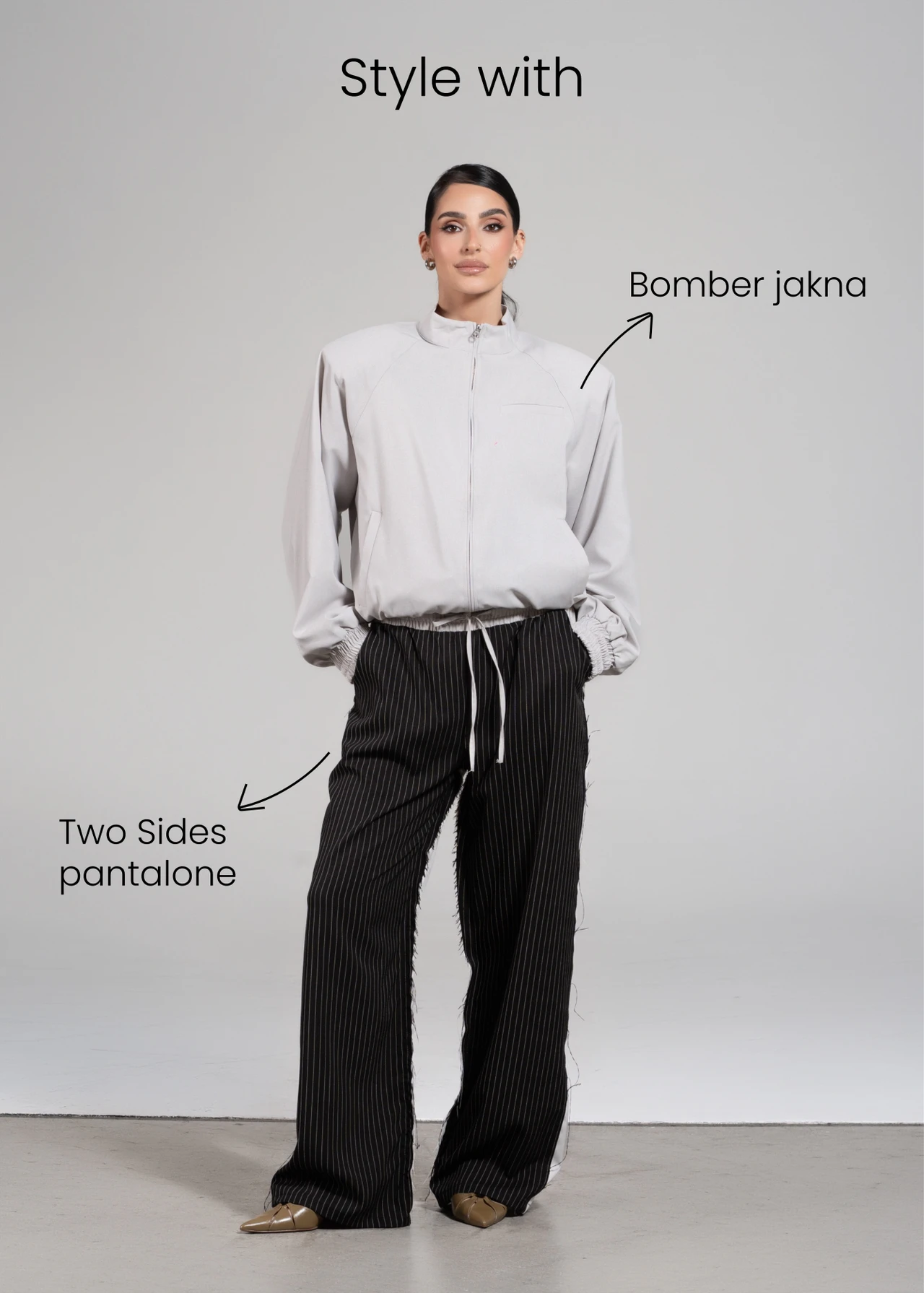 Two Sides pantalone od 70 % viskoze i 30 % pamuka. Ravan i opušten kroj sa dugim nogavicama i lastišem oko struka. Dizajnirane sa dve strane : prednja je crna sa svetlim prugama, a zadnja u svetlo sivoj boji.